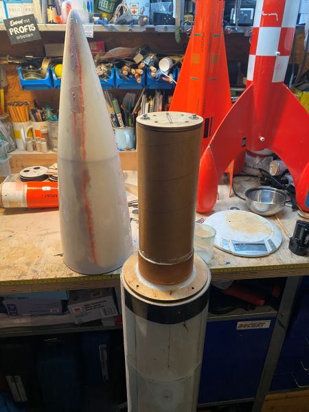 ich hätte schon weiter sein können, aber ich habe den ersten Tag meines Urlaubs genutzt, um meine Werkstatt gründlich aufzuräumen. Ich habe tatsächlich wieder so etwas wie reichlich Platz auf meiner Werkbank..... Ein absolutes Highlight unter den Umständen weiter zu basteln und zu kleben! Und ich kann vermelden, alle Ringe, Spanten, Innenrohre, Gewindemuffen, Haltebügel und sonstiges Gedöns hat seinen Platz gefunden. Ziemlich praktisch an einem 4" Innenrohr ist, das wenn man das Innenleben von unten nach oben aufbaut, man bis zuletzt fast überall noch jederzeit mit der Hand rankommt. Ganz schön heftiges Teil mittlerweile. Die Spitze hat einen 2x 6mm Haltering mit vier Stück M4 Gewindemuffen eingesetzt bekommen, der trägt später mal das Innenrohr (Kupplerrohr) mit E-Bay Weiter vorne / oben in der Spitze sitzt ein Zentrierring, der das Innenrohr führt um seitliche Belastungen (Kippen) an der Schraubverbindung zu vermeiden. Auf dem Innenrohr sitzt das Gegenstück zum Haltering. Links ist der Kuppler, rechts der Teil der in die Spitze ragt. Dort, soweit oben wie möglich (auf dem Bild ganz rechts) wird später die E-Bay mit dem Haltepunkt und dem Release für den Fallschirm sitzen. Der E-Bay Einsatz wird sich später von oben auf dem Rohr abstützen und um mit dem Zug die schmale Klebefläche des Passrings nicht auf Scherung zu belasten, habe ich darüber einen amtlichen Stützring aus 4" Rohr verklebt. Das ändert zwar nichts an der Belastungsrichtung, aber erhöht die Klebefläche um ein vielfaches. So kann das Rohr definitiv nicht durch den Ring gezogen werden. Soweit Geändert von Kabelmann am 21. Dezember 2025 um 21:40 |