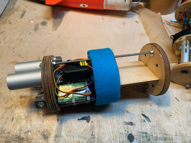 Die Elektroniken (Altimax und Altimax Simply) und andere unerhebliche Kleinigkeiten fehlen noch, aber das Grundgerüst ist fertig, Funktionell habe ich mich da stark an der E-Bay meiner 3" Harpoon orientiert, diese hat bei vielen schönen Flügen immer zuverlässig ihren Dienst getan. Wenn nicht gleich, so sind die Bedingungen dort zumindest ähnlich: - Position in der Spitze - Eigengewicht ist zugleich Trimmgewicht - Serielle zweistufige Bergung Das ganze wird von oben in das Kupplerrohr in der Spitze eingesetzt und stützt sich auf dem oberen Rand ab. Das untere Abteil (im Bild rechts) bietet Platz für den RC Schlepphaken und das (nicht gerade kleine) Servo um diesen zu betätigen, sowie für die beiden 3S LiPo Akkus. Das obere Abteil enthält die Montageplatte für die beiden barometrischen Höhenmesser. Dieses Abteil ist durch Löcher im oberen Bulkhead mit dem Umgebungsdruck innerhalb der Spitze verbunden. An geeigneter Stelle wird die Spitze drei kleine Ventilationsöffnungen nach außerhalb der Hülle haben. Außerhalb, "auf dem Dach" der EBay werden zwei Magnetschalter Platz finden, um die Elektroniken von außerhalb der Raketenhülle mit einem Dauermagneten einzuschalten. Der mittlere Bulkhead dient als gas- und druckdichte Trennung zwischen den beiden Abteilen. Hier sitzt ein 2,5cm Ring aus Phenolrohr der mit Filz beklebt ist. Eine unauffälligere Farbe gabs leider nicht, dafür war der Filz kostenlos. Geschenktem Gaul..... Die Dichtung ist so eng toleriert, das sich die ganze EBay nur mit erheblicher Kraft in das Kupplerrohr schieben lässt. Diese Konstruktion hat schon in der Harpoon die Höhenmesser zuverlässig vor dem Druckstoß der Ausstoßladungen auf der anderen Seite geschützt. Bin tatsächlich am Überlegen, auf seitliche Verschraubungen im Kupplerrohr zu verzichten. Schauen wir mal. Rechtzeitig vor Weihnachten kam auch Bäckchens Paket mit dem gefrästen Pyrorelease an, welches ebenfalls noch auf dem Bergespant Platz brauchte. An dieser Stelle noch einmal vielen lieben Dank dafür, Bäckchen. Die kleinen Löcher sind für die Zuleitungen der Klemmen für die Zünder der drei Ausstoßladungen. Die beiden Behälter werden die Austoßladungen für die Trennung am Gipfelpunkt beinhalten. Ein Behälter Main-Elektronik (Altimax), ein Behälter Backup-Elektronik (Simply). Es wird einen Packsack (Deploymentbag) für den Hauptschirm geben, der an einem Ring hängt, durch den eine dünne Seilschlaufe läuft, welche auf der einen Seite durch den Servohaken und auf der anderen Seite durch den Bolzen im Pyrorelease gehalten wird. Freigabe erfolgt entweder über das Öffnen des servobetätigten Schlepphakens (Altimax) oder durch Freigabe durch Zünden des Pyrorelease (Simply). Das jeweils freie Ende der Seilschlaufe läuft durch den Ring und der Deployment Bag ist frei. Soweit der Plan. So dürfte ich über ein vollständig redundantes, serielles Bergesystem verfügen. Geändert von Kabelmann am 06. Januar 2026 um 18:47 |