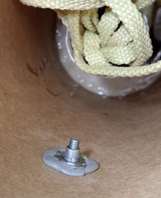 So habe ich dann die Einschlagmutter eingebaut und mit einer Schraube so festgezogen, dass sie in die Knete gedrückt wird, aber ohne dass das Gewinde der Schraube verklebt wird. An meinem Teststück hält das allein schon irre fest. In der Flamingo werde ich noch einen Klecks Epoxy über das ganze geben.