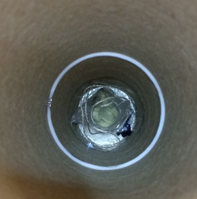 Nachdem sich das Epoxy unten gesammelt hatte, konte ich es -durch Bewegen der Rakete- an den zu klebenden Kanten entlangfließen lassen. Das hat recht gut funktioniert, wenn es auch ein wenig viel Epoxy war...