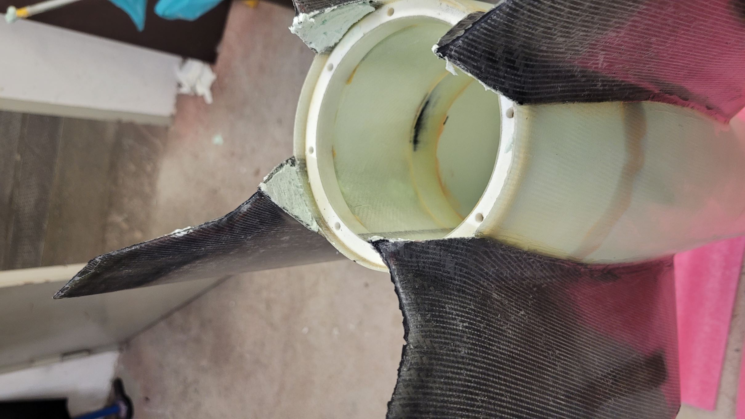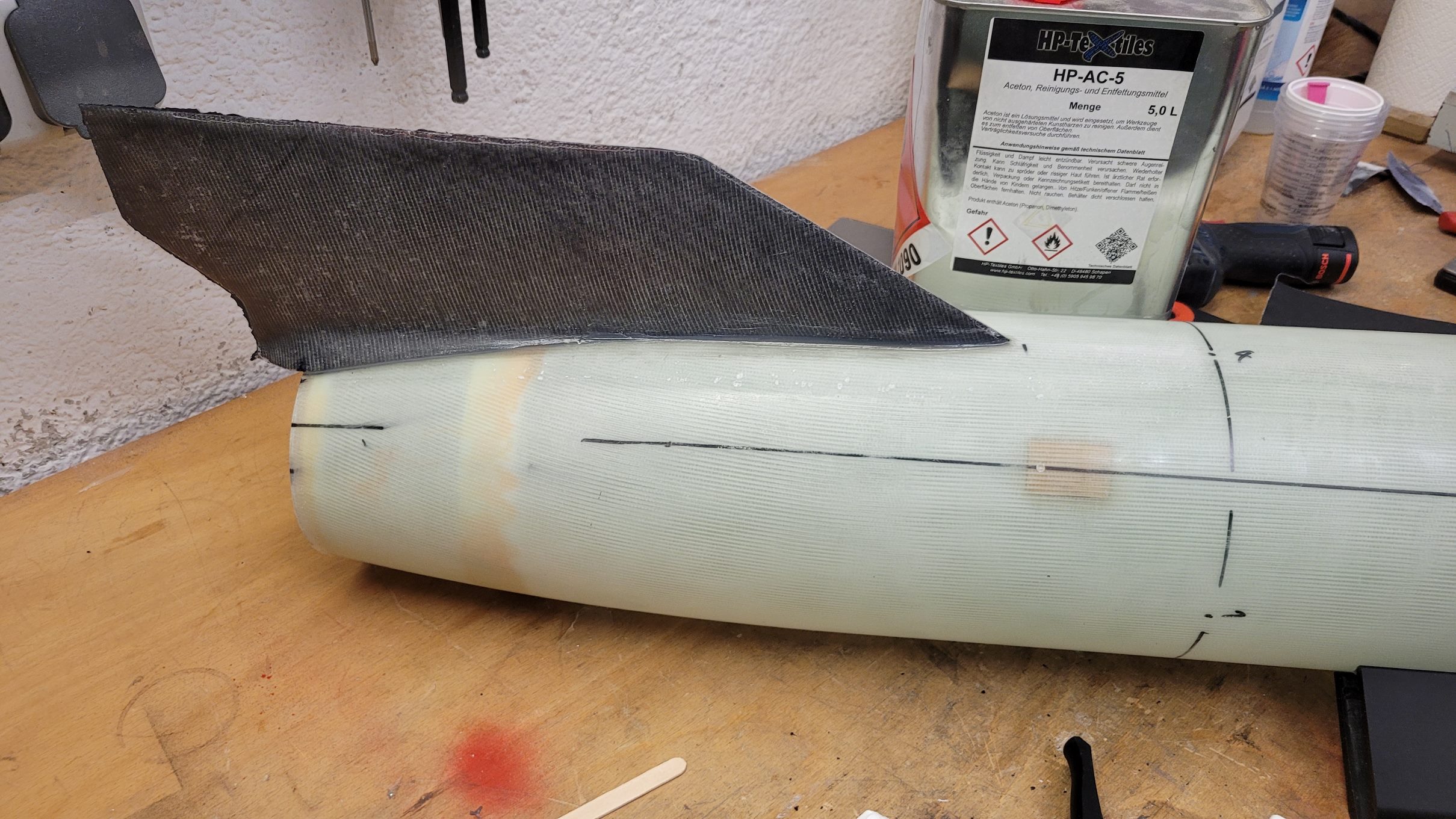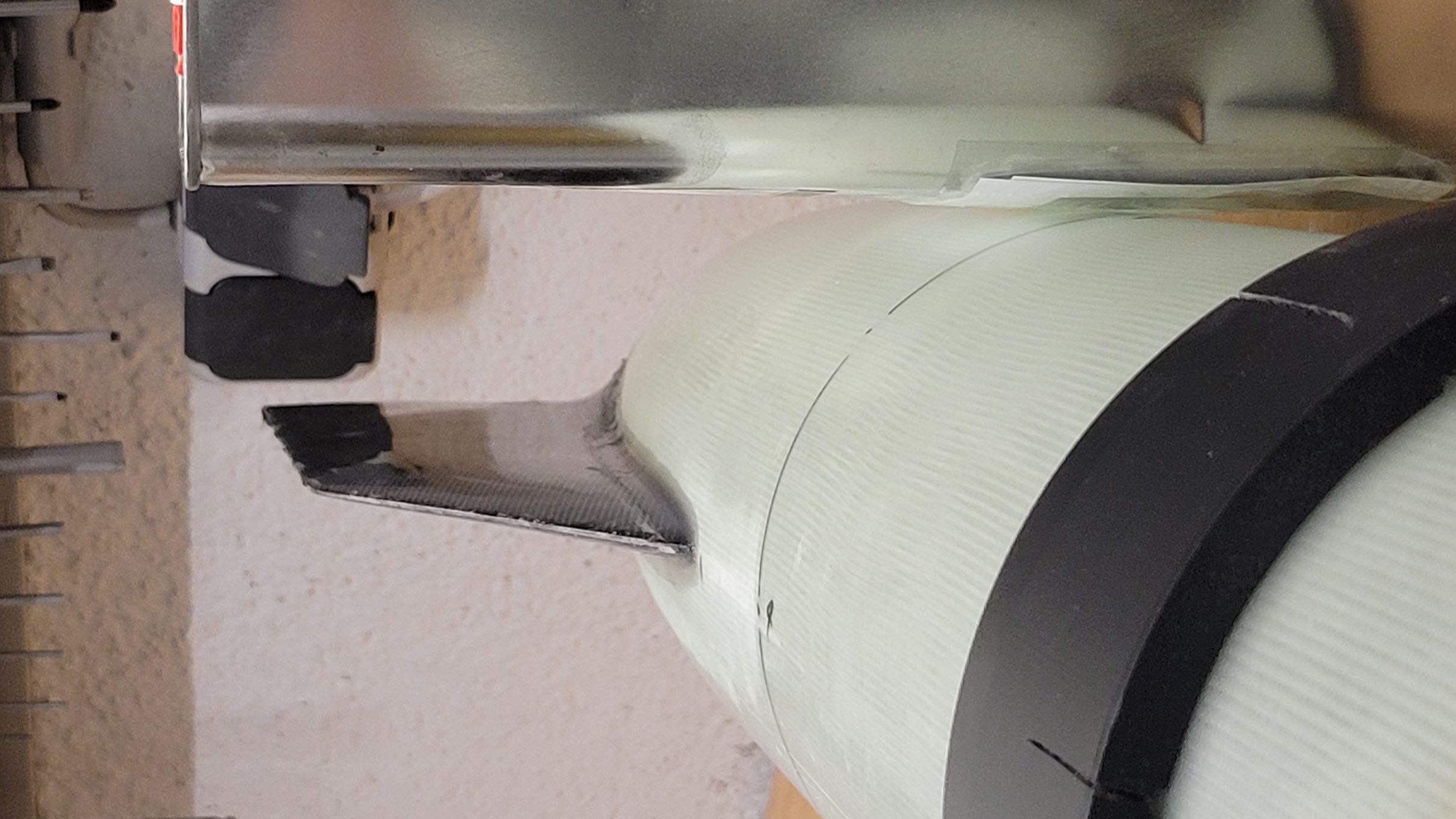 ![]() Zitat: Ich bin mit dem Baubericht etwas hinterher, aber ich kann schon mal so viel sagen: die A&S-Maßnahmen haben gehalten ![]() Zusätzlich den Carbon-Verstärkungen habe ich am Schockbandanker noch zwei Sperrholzklötze verklebt. Dazu habe ich erst Quader ausgesägt, mit einem Schlitz versehen, damit ich ein Flacheisen drin verklemmen kann und 2 diagonale Ecke rundgeschliffen. So konnte ich sie von oben gut einsetzen - an der Engstelle (Kuppler der Rumpfverlängerung) vorbei und ein Position rotieren. Verkleben ging gut, fotografieren eher weniger: Das Befestigen der Flossen ging dank einer gedruckten Vorrichtung wie von selbst. Als Klebstoff habe ich einen Strukturklebstoff verwendet, der auf GFK/CFK hochfeste aber flexible Verklebungen ermöglicht. Es ist wirklich erstaunlich wie viel diese Klebstoffe mehr können als bspw. 5-min-Epoxy ![]() Banana for scale ![]() Sandwiches stärken! Das gilt auch für Composite-Konstruktionen wie die Flossen, also wurden die ausgeschäumt. Den guten 2K PUR Hartschaum habe ich nicht so schnell ranbekommen und stattdessen - trotz Andreas zu 110% zutreffender Warnungen - 2K Schaum aus der Dose verwendet. Die 3min Verarbeitungszeit sind eine Lüge und das Zeug kommt innerhalb von kürzester Zeit so derartig zäh aus der Düse, dass gar nicht daran zu denken war mittel bereitliegendem Verlängerungsschlauch auch das Heck noch auszuschäumen... Getrimmt: Apropos Trimmen: ich mag kein Ballastgewicht. Klar, bei manchen Modellen führt kein Weg daran vorbei, aber wo möglich möchte ich kein Modell unnötig schwer machen. Deswegen landet bei der A4 alles was eh rein muss in der Spitze. Und viel gibt es da nicht außer Elektronik und Bergungssystem, erstere wurde am Innenrohr der Spitze untergebracht, erstmal ein Simply und ein SALT: Von unten sieht der Abschlussspant des Innenrohrs so aus: Der Hauptschirm steckt in einem Packsack und hängt direkt an der Pyromechanik, kann also nirgends hin und bringt den Schwerpunkt nach vorn. Damit der Vorschirm und die ganzen Leinen beim Start nicht ins Heck rutschen habe ich noch einen Schott gedruckt, der auf Höhe des Schockbandankers auf einem schmalen Ring aufliegt: Der Schott kann natürlich entnommen werden wenn längere Motoren geflogen werden sollen ![]() Apropos fliegen: tut sie! Gestern war es soweit... aber dazu mehr wenn ich ein paar Fotos davon habe. 'Technisch gesehen hat alles funktioniert!' -Ich (oft kopiert) |