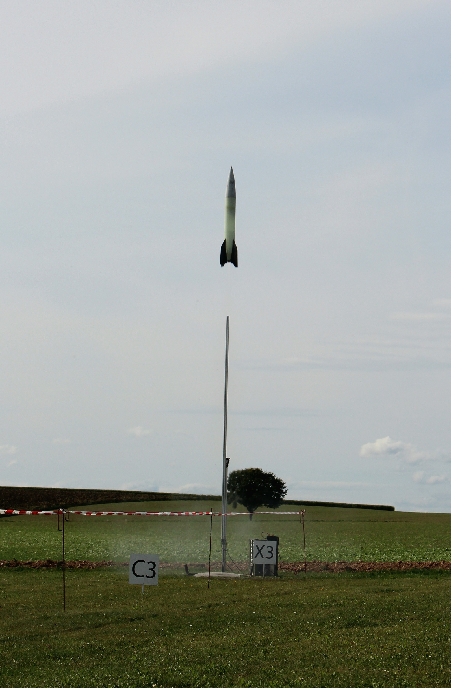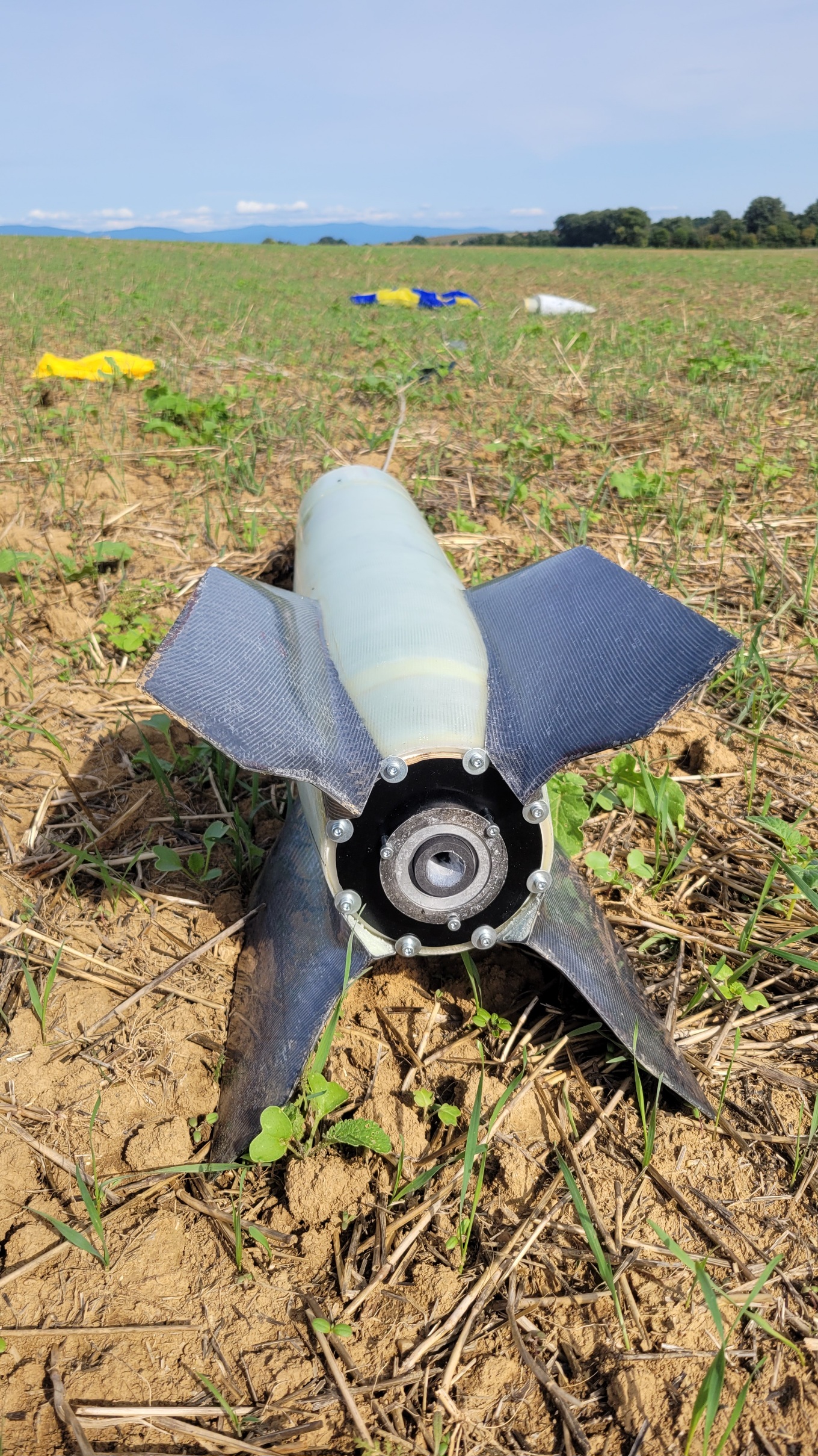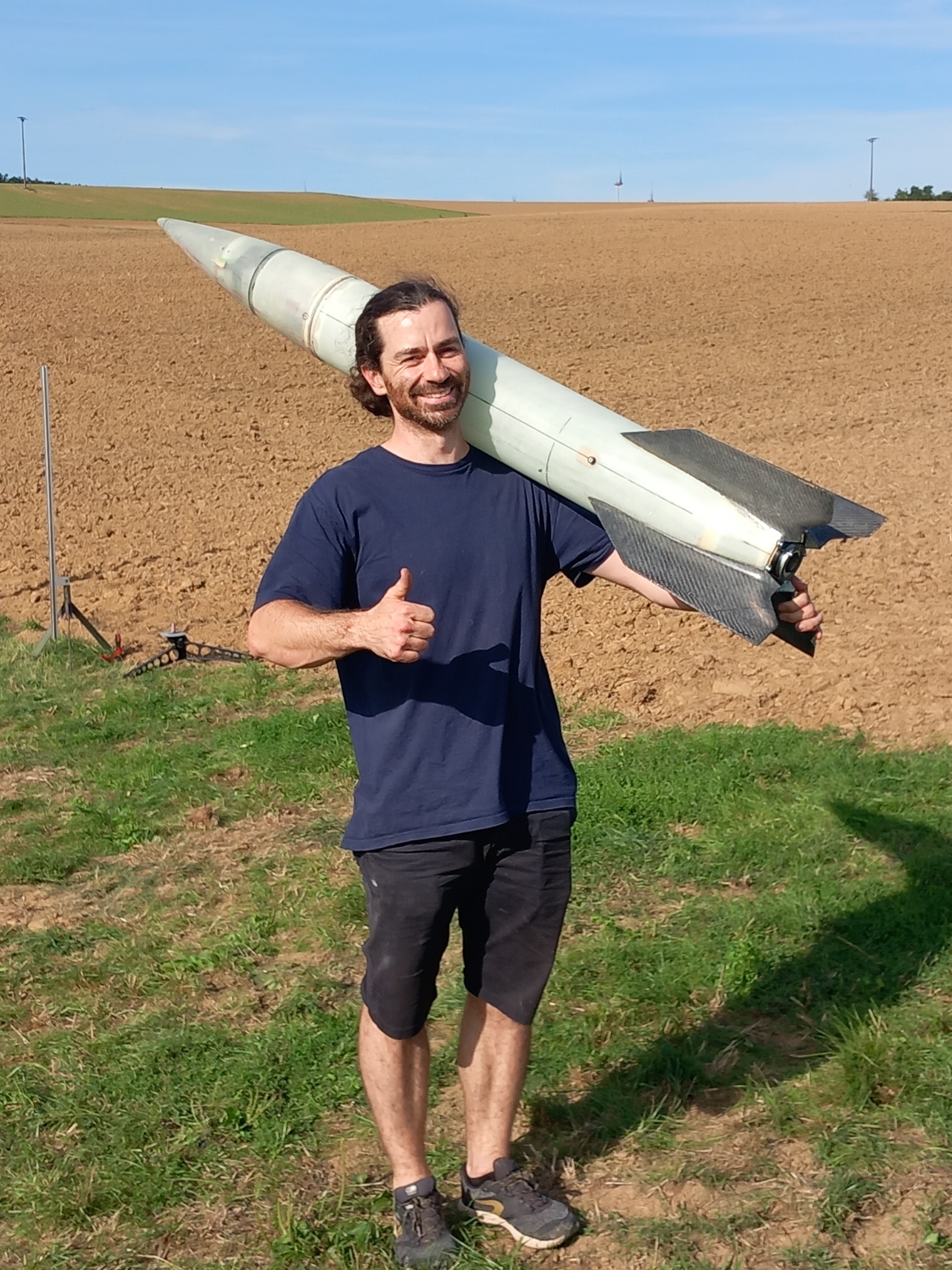 Der Erstflug fand am 6.09. beim RMV Experimental- und Scale-Wettbewerb statt und erreichte mit ~650Ns knapp 370m Flughöhe. Eigentlich hätte es über 400m gehen sollen, aber der Vorschirm würde zu früh ausgeworfen, dazu später mehr. Hier ein paar Screenshots aus den Videos die ich bekommen habe: Und frisch geborgen ![]() Keine Woche später gab es dann die nächste Gelegenheit für Flüge beim Solaris-Flugtag in Straubing. Zunächst mit der gleichen Motorisierung, diesmal mit Auswurf am Gipfelpunkt und nicht davor (407m): Der Vorschirm hatte sich in seinem Schutztuch verwurstelt (ja das ist ein Wort) und wollte nicht aufgehen. Bei serieller Zweistufenbergung nicht ganz ideal, aber der Hauptschirm kam trotzdem wie geplant, da in der Rakete genug Platz ist und alles lose gepackt werden kann. Nach zwei Flügen nahe am Original (Flüssig-Flüssig-Antrieb) folgte noch einer auf Hybrid (mehr dazu hier! ). Knapp 800Ns beförderten sie auf 550m: Nächster Halt: Lackierung... 'Technisch gesehen hat alles funktioniert!' -Ich (oft kopiert) |